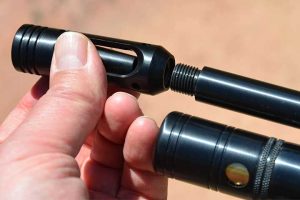 Air Strippers are an increasingly popular device which can connect in the same way to the end of the barrel. These again have ports or holes cut into the outer body, but also feature a small aperture, either a hole, series of holes, or an internal cone section. The idea here is that the pellet exits the barrel, then almost immediately passes through the aperture or cone, and this has the affect of stripping away the spent turbulent air following the pellet, leaving it unruffled on it’s way to the target.