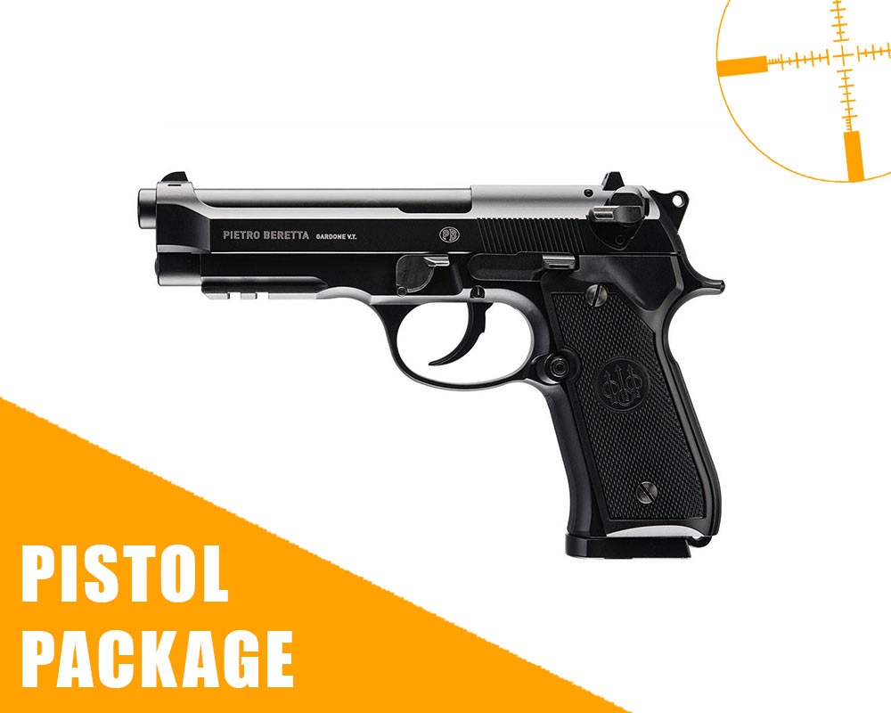 The Beretta M92 A1 Blowback BB Package uses the all-metal, 18-shot BB version of the famous Italian (and American) service pistol, with a realistic blowback effect.