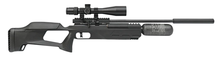 A new PCP from BSA. A Side-lever, Regulated performance PCP with all the usual refinements of BSA. With match grade adjustable trigger, cold hammer forged barrel, both producing unrivalled performance, large shot count from it’s Carbon Wrap air reservoir, ‘Blast Tamer’ valve system, all neatly wrapped in a Brand-New synthetic stock. Manufactured with a picatinny rail for ultimate flexibility of optics and accessory mounting, plus the option of an extended front picatinny rail for ultimate versatility.
