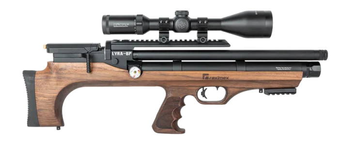The latest addition to the Lyra series, this compact Reximex Lyra Bullpup PCP measures just 24″ overall and is equipped with a 42 cm shrouded barrel with ½” UNF adaptor and a 210 cc air cylinder.